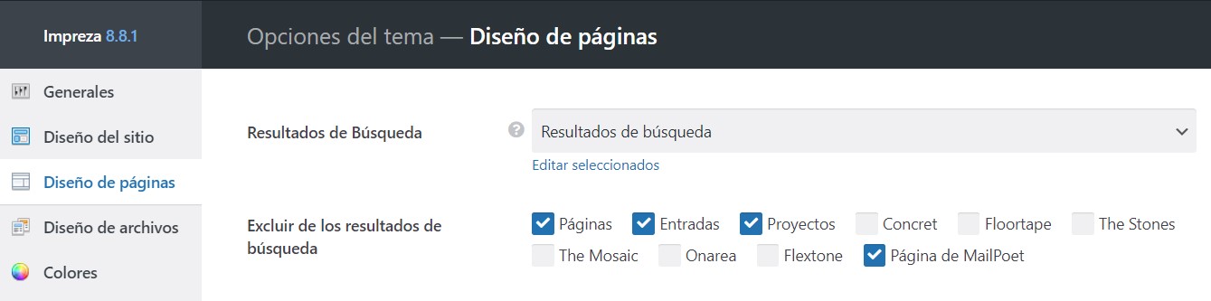 En la barra de la izquierda Impreza -> Opciones del tema tenemos que seleccionar en resultados de búsqueda la página que hemos creado y luego en la opción excluir de los resultados de búsqueda seleccionamos los elementos que no queremos que aparezcan cuando haga una búsqueda.