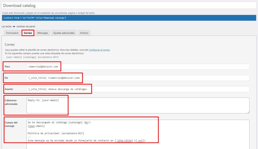 - Configuramos el formulario de contacto, insertamos el código que encontraremos en el archivo lincado.