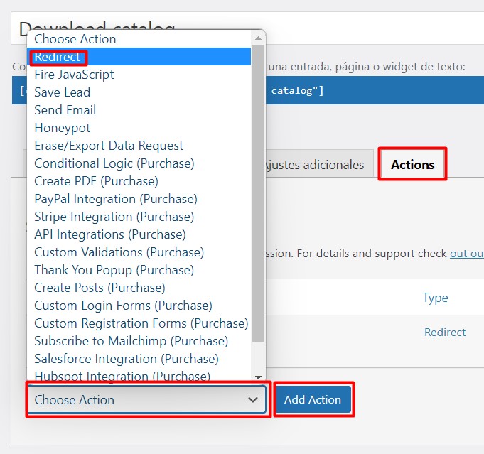 Luego vamos a la pestaña Actions y en el desplegable seleccionamos Redirection y hacemos click en Add action.